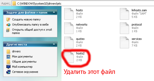 2. Открыть блокнотом файл hosts. (если есть файл host2 или hosts2, то удаляем этот файл)