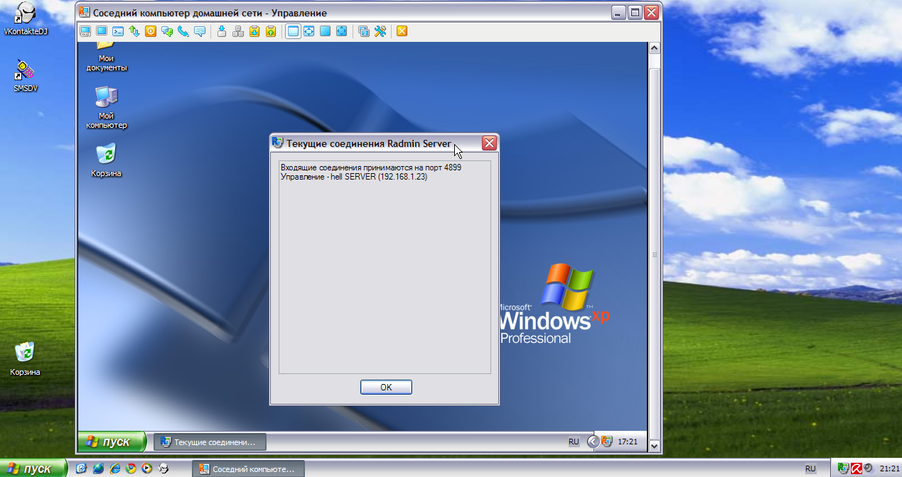 Наконец, можно попробовать подключиться к соседнему компьютеру и оценить всю мощь Radmin. Однако для этого необходимо знать IP адрес соседнего компьютера. Ничего сложного здесь нет. Направляйтесь к соседнему компьютеру, наведите курсор мышки на значок Radmin Server в трее около часов и запомните, а еще лучше запишите, появившейся там IP адрес.
