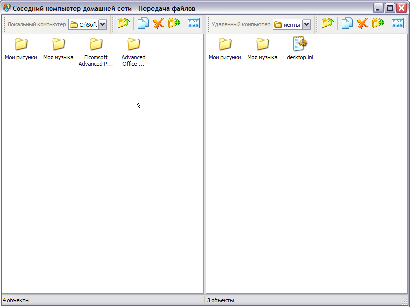 После чего вы увидите окошко, разделенное на две части. В левой части окна находятся файлы и папки локального компьютера, за которым вы работаете. В правой части окна расположены файлы и папки удаленного компьютера, к которому вы подключились через Radmin.