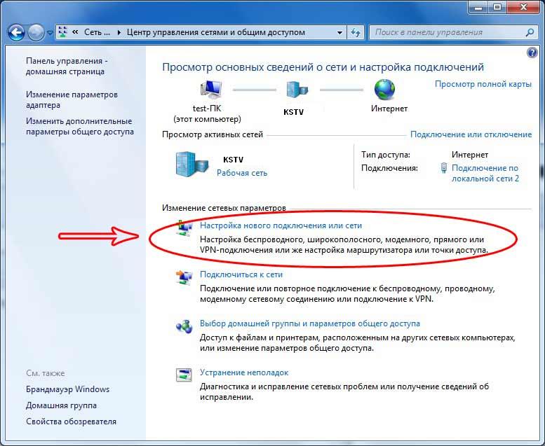 3. Нажмите Настройка нового подключения или сети