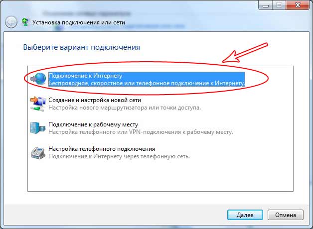 4. Выберите пункт Подключение к Интернету, Беспроводное, скоростное или телефонное и нажмите Далее