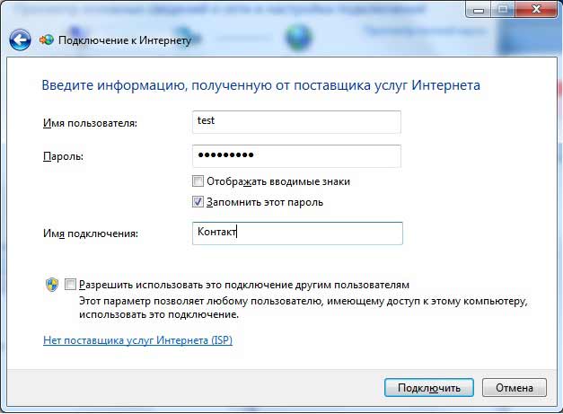 7. В поле Имя пользователя введите имя из анкеты, из строчки PPPoE. В поле Пароль введите пароль. Установите галочку Запомнить этот пароль. В поле Имя подключения введите Контакт. При наличии на компьютере других пользователей установите галочку Разрешить использовать это подключение другим пользователям.