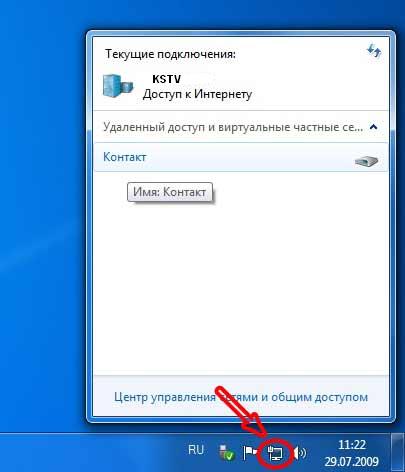 8. Вызвать подключение можно, нажав левой кнопкой на пиктограмму компьютера в правом нижнем углу. Выбрать Контакт и нажать на Подключение