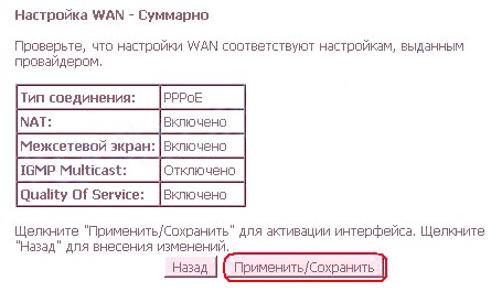 Соединение создано, нажимаем Применить/Сохранить. На этом базовая настройка соединения на Sagem fast 2804 Закончена.