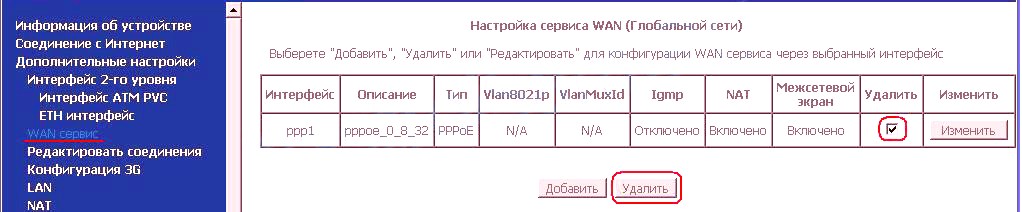 Шаг1. Удаляем существующее PPP-подключение. Выбираем раздел Дополнительные настройки -> WAN сервис.