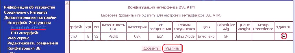 Шаг2. Удаляем существующие настройки WAN-порта. Выбираем раздел Дополнительные настройки -> Интерфейс второго уровня -> Интерфейс ATM PVC.