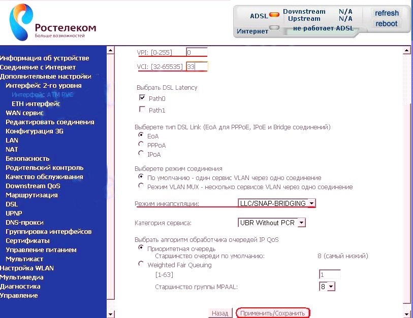 Выставляем параметры VPI/VCI — в филиалах Ростелекома стандарт единый — 0/33. Тип DSL Link по умолчанию стоит EoA — он используется и для режима PPPoE и для Bridge. Режим инкапсуляции - LLC. Нажимаем кнопку Применить/Сохранить.