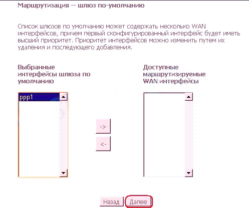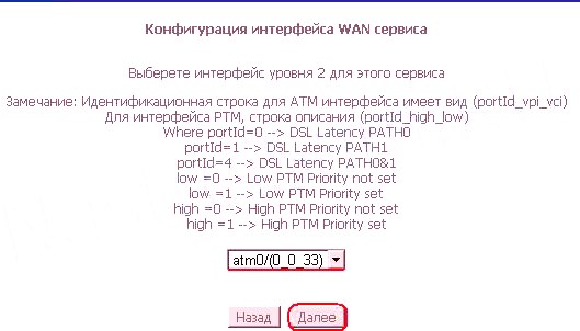 Следующим шагом выбираем физический интерфейс atm0 и нажимаем Далее.