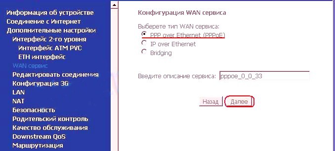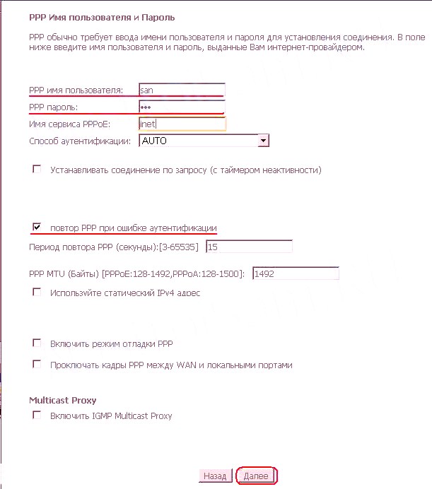 В этом окне вводите имя пользователя и пароль, выданные Вам при подключении. В поле Имя сервиса PPPoE можно ввести название соединения — например inet. Далее ставите галочку повтор PPP при ошибке аутентификации и нажимаете кнопку Далее.