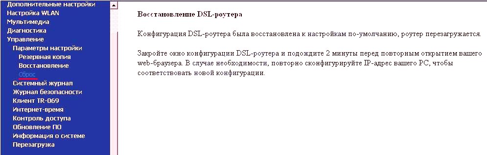 Здесь нажимаем кнопку Перезагрузка и ждем пока устройство перезапустится. Если Вы что-то сделали неправильно и сомневаетесь — сбросьте устройство к заводским параметрам и настройте заново. Чтобы сбросить конфигурацию до заводских параметров перейдите в раздел Управление -> Параметры настройки -> Сброс: