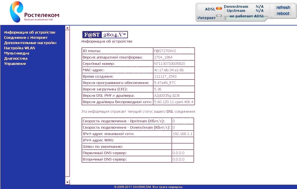По настройке каких-то особых сложностей Sagem FAST 2804 не вызывает, тем не менее веб-интефейс немного запутан. Адрес устройства в сети стандартный — , логин admin и пароль admin. Пароль для superadmin - Is$uper@dmin.