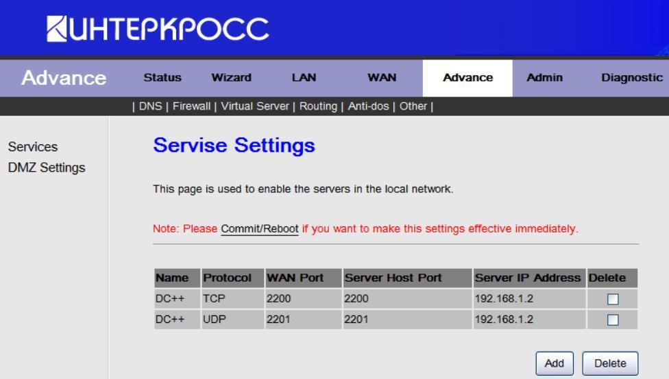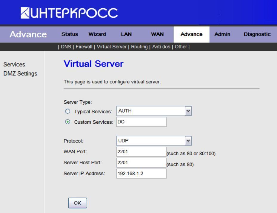 Далее ниже в поле Protocol выбираем протокол – TCP или UDP.  Сделаем 2 правила – для обоих протоколов.  Выбираем сначал TCP, далее WAN Port ставим в диапазоне от 1 до 65535. например 2200. Server IP Address так же ставим 2200. Жмем ОК. Вновь попадаем на предыдушее меню и снова жмем Add.