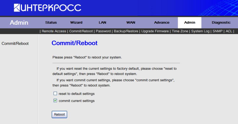 Ставим галку на пункт commit current settings и жмем кнопку Reboot.