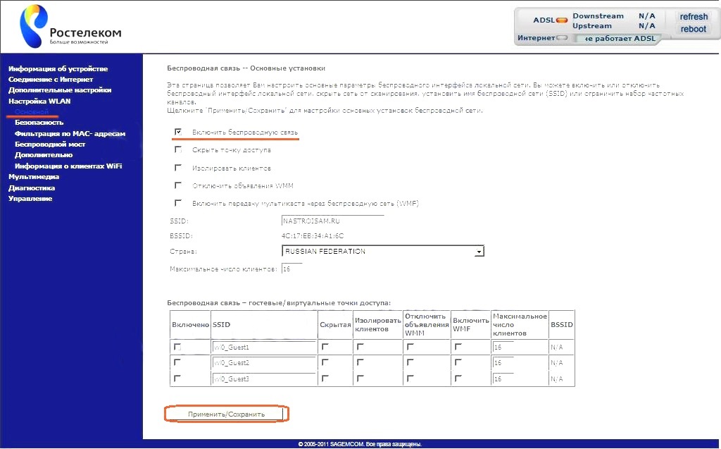 Настройка беспроводной сети на sagemcom 2804 находится в разделе Настройка WLAN. Включается беспроводной модуль во вкладке Основной установкой галочки Включить беспроводную связь: