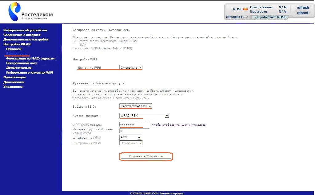WPS я обычно отключаю, т.к. на мой взгляд эта функция не нужна. SSID сети обязательно вводите какой-нибудь свой, желательно не содержащий в себе марки и модели роутера. Тип аутентификации — WPA2-PSK, тип шифрования оставляем по-умолчанию и задаём свой ключ сети.