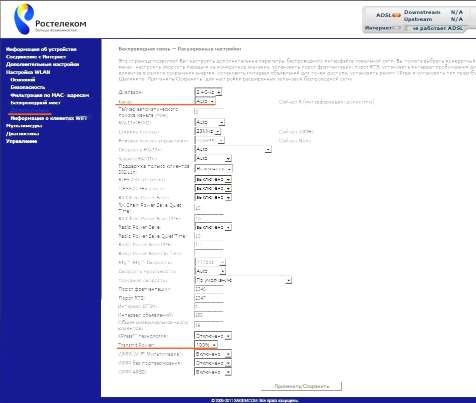 Здесь, например, можно изменить выбор канала с Auto на любой другой, подобрав менее загруженный. Вторая рекомендация — выставить по возможности наименьшую силу сигнала — Transmit power. Подберите этот параметр таким образом, чтобы по квартире сигнал был, а за пределами был минимальным.