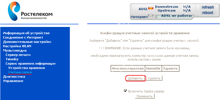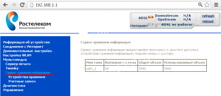 Адрес веб-интерфейса роутера по-умолчанию http://192.168.1.1, логин для доступа admin и пароль admin, если конечно его не сменили при настройке. Идем в раздел Мультимедиа > Сервер хранения информации: