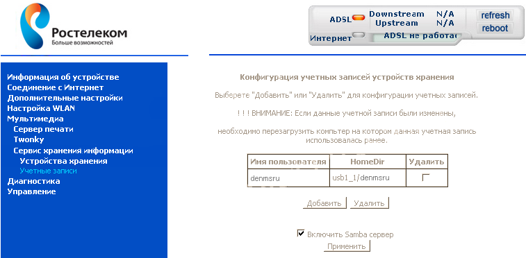 В поле Имя пользователя указываем любое имя в латинской раскладке, а в поле Пароль и Подтвердите пароль — вводим произвольный пароль на доступ — им может быть любая буквенная, цифирная или смешанная последовательность символов. Под этой учетной записью мы будем заходить на встроенный Samba-сервер Sagemcom 2804.  В поле имя тома указываем имя из таблички выше — usb1_1. Нажимаем кнопку Применить/Сохранить. Нас вернет назад, в Учетные записи.