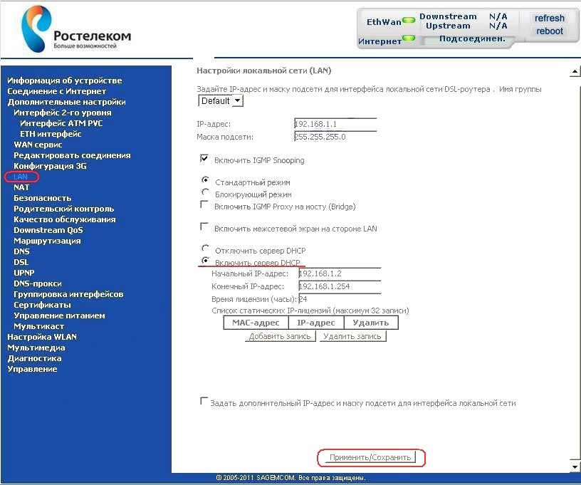 Затем идём в раздел Дополнительные настройки -> LAN:
