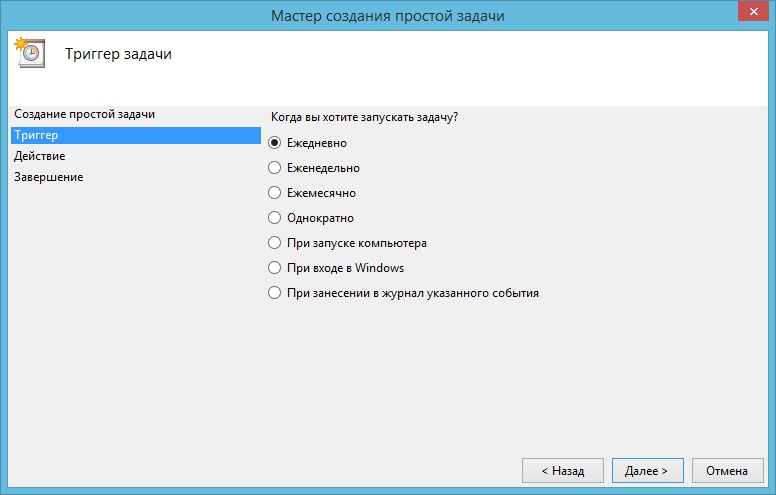 Нажмите далее, и укажите, в какое время суток запускать задачу.