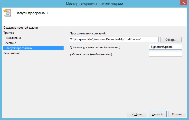 Вместе с Защитником Windows поставляется консольная утилита MpCmdRun.exe. Она представляет собой инструмент для управления параметрами Защитника из командной строки. Одна из её опций, "-SignatureUpdate", принуждает Защитник обновить вирусные сигнатуры немедленно. Сама утилита находится по следующему пути: