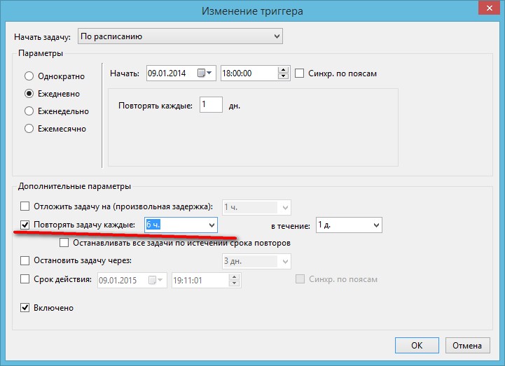 Установите флажок "Повторять задачу каждые" и задайте время повторения задачи в часах. Это время и будет означать интервал запросов новых вирусных сигнартур.