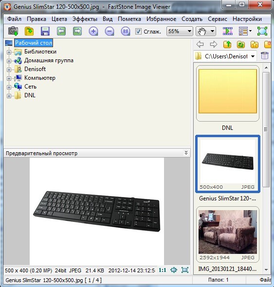 FastStone Image Viewer - программа для просмотра и конвертации графических файлов многих форматов. С ее помощью можно просматривать и редактировать графику, улучшать её качество, менять масштаб, осуществлять повороты рисунка, корректировать цвет, насыщенность, яркость и контрастность. В полноэкранном режиме можно просматривать картинки в режиме слайд-шоу с использованием более 150 различных эффектов перехода. Имеет множество интересных возможностей, поддерживает работу с форматами BMP, JPEG, JPEG 2000, GIF, PNG, PCX, TIFF, WMF, ICO и TGA, а также популярные RAW форматы цифровых камер, содержит разнообразные инструменты, например, для удаления эффекта красных глаз, отправки картинок по электронной почте и изменения размеров изображений. Предоставляет доступ к служебной информации EXIF, а браузер с функцией предварительного просмотра быстро выводит список всех файлов в избранном каталоге с предварительным просмотром.