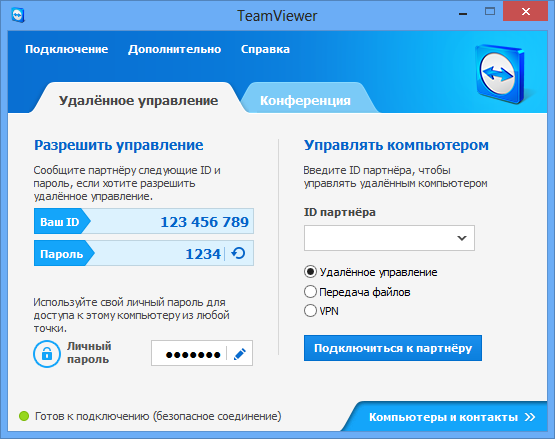 TeamViewer предоставляет понятный и простой интерфейс. Вам просто нужно выбрать, что вы хотите – удалённо управлять компьютером вашего партнёра, показать ему свой рабочий стол или передать файлы. |