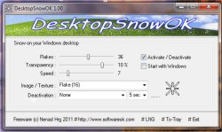 DesktopSnowOK (Portable) - украшение рабочего стола: летящие по нему снежинки. Программа хорошо настраивается, включая настройку степени прозрачности снежинок, и потребляет крайне мало системных ресурсов. Не требует инсталляции.